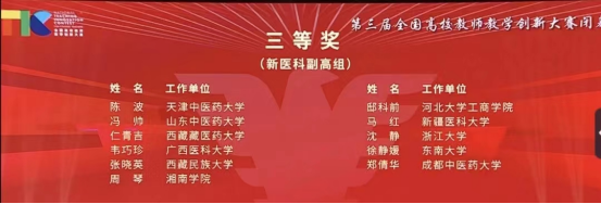 2023年8月18-22日,第三届全国高校教师教学创新大赛在浙江大学圆满举办。我校陈波老师《针灸学》课程团队首次入围大赛国赛,荣获新医科副高组三等奖。